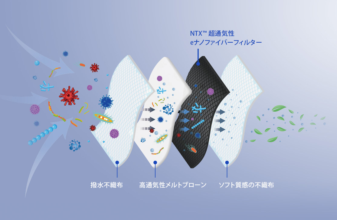 従来のN95(US)、FFP2(EU)、KN95(CN)などの保護マスクは、ろ過効率を満たすために、複数の厚い重い層と静電化学処理に依存しています。これらは呼吸がしにくいことが多く、湿度の高い場所に保管したり、さらしたりするとその機能が損なわれる可能性があります。私たちの新しい NTX® eナノファイバー フィルターは、優れた通気性と快適さを実現するために、わずか4層の薄い層で、化学処理なしで優れたろ過効率と保護を保証します。