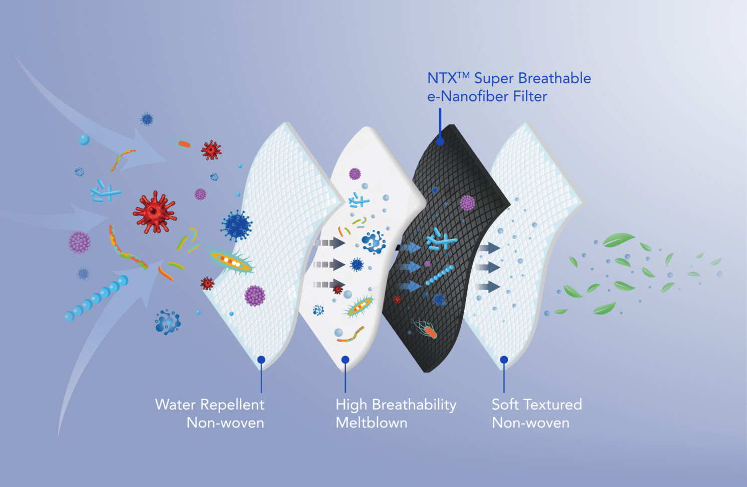 Conventional N95 (US), FFP2 (EU), KN95 (CN), etc., respirators rely upon multiple thick heavy layers and electrostatic chemical treatments to meet filtration efficiencies. These are often difficult to breathe through and can be compromised when stored in or exposed to high moisture environments. Our novel NTX® e-Nanofiber filter enables the assurance of superior filtration efficiencies and protection without chemical treatments with only 4 thin layers for superior breathability and comfort.